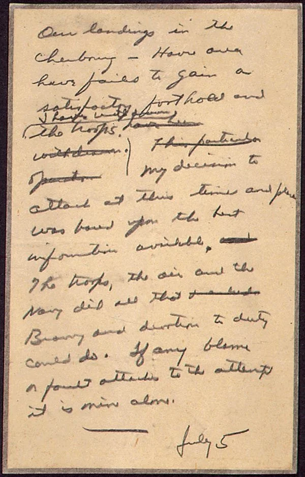 “Our landings in the Cherbourg-Havre area have failed to gain a satisfactory foothold and I have withdrawn the troops. My decision to attack at this time and place was based on the best information available. The troops, the air and the Navy did all that bravery and devotion to duty could do. If any blame or fault attaches to the attempt it is mine alone.”